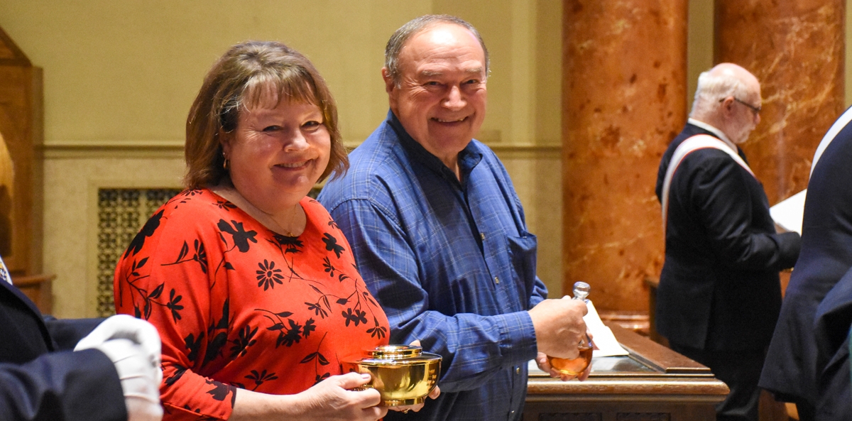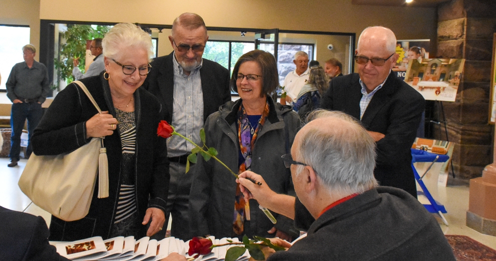 (Top photo) Bishop John Doerfler elevates the Eucharist at the Milestone Wedding Anniversary Celebration Mass while Dcn. Terry Saunders (left) and Msgr. Michael Steber (right) look on. The Mass was held at St. Peter Cathedral in Marquette on Sept. 17, 2023. (Middle left photo) A couple celebrating a milestone anniversary in attendance at the Mass hold hands. (Middle right photo) Honorees bringing up the gifts smile for a photo. (Bottom photo) Honorees of the Milestone Wedding Celebration smile as roses are handed out to the wives in attendance.